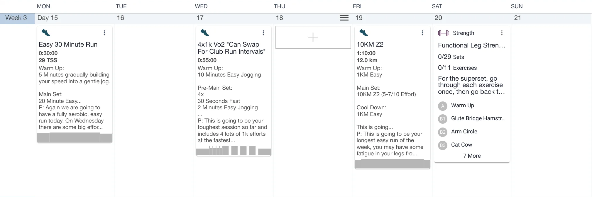 Training sessions are written in an optimal order for improvement, progression and recovery, but plans change and when they do you can move sessions across days and weeks with a premium training peaks account.