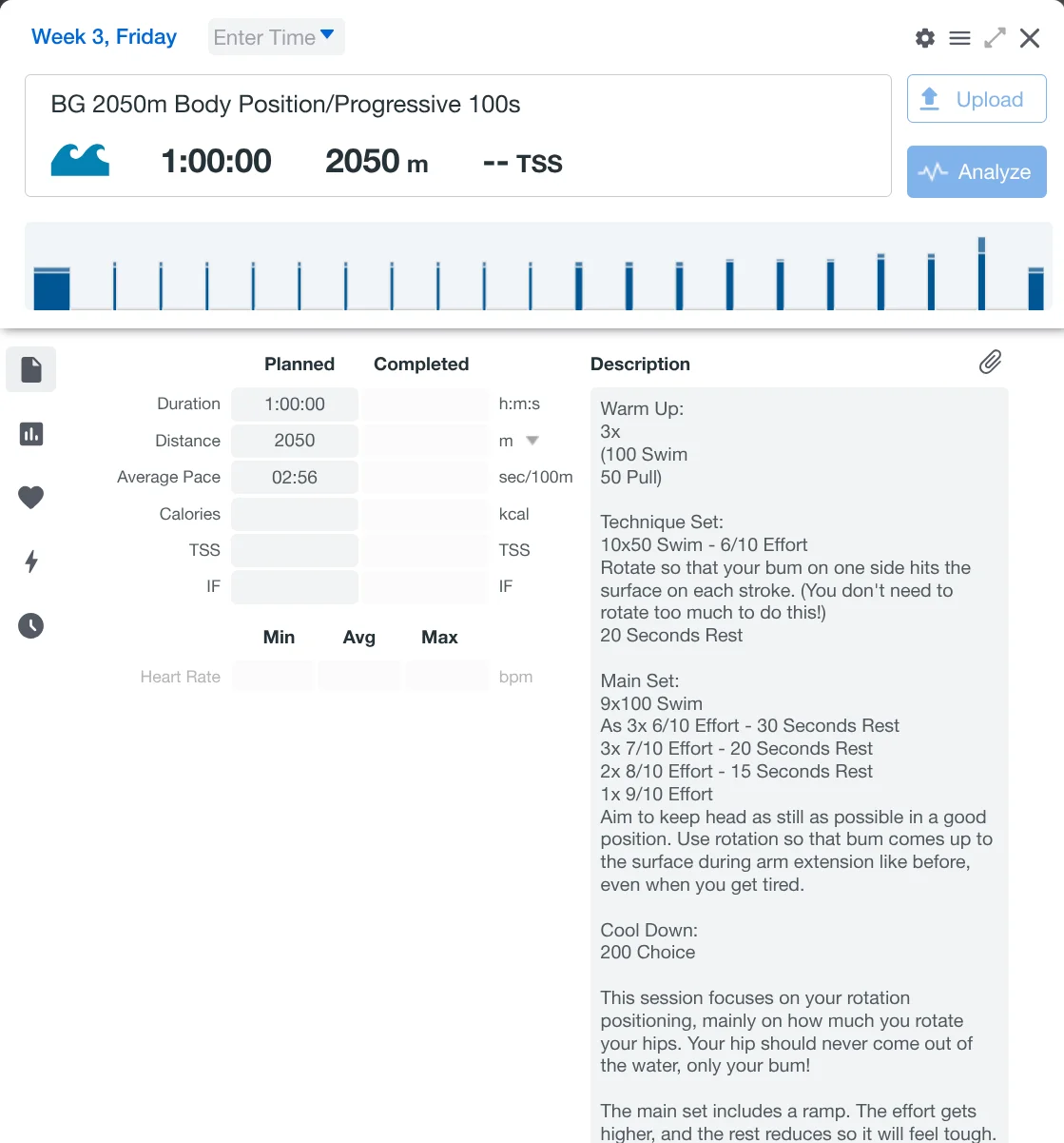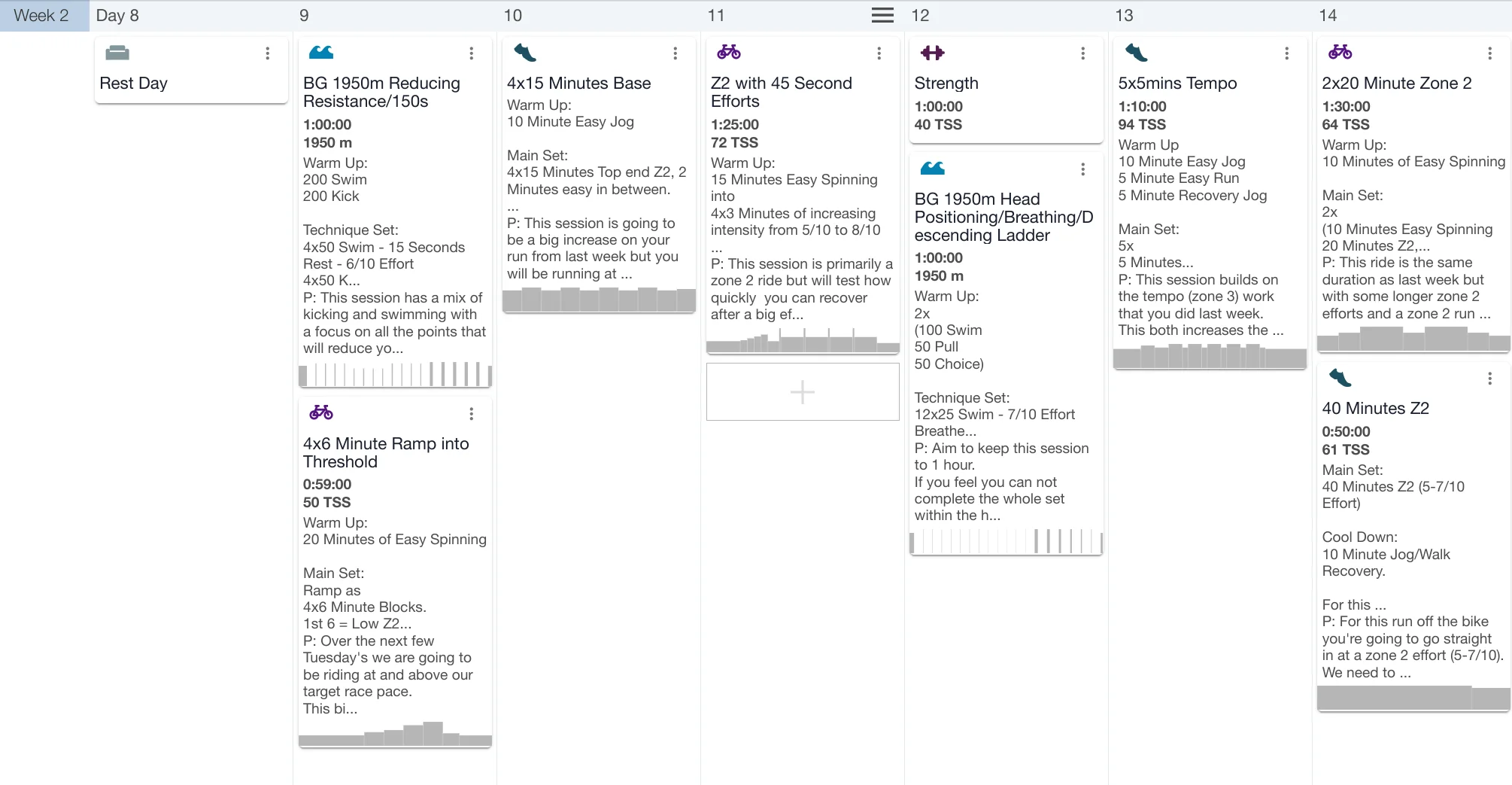 Training sessions are written in an optimal order for improvement, progression and recovery, but plans change and when they do you can move sessions across days and weeks with a premium training peaks account.