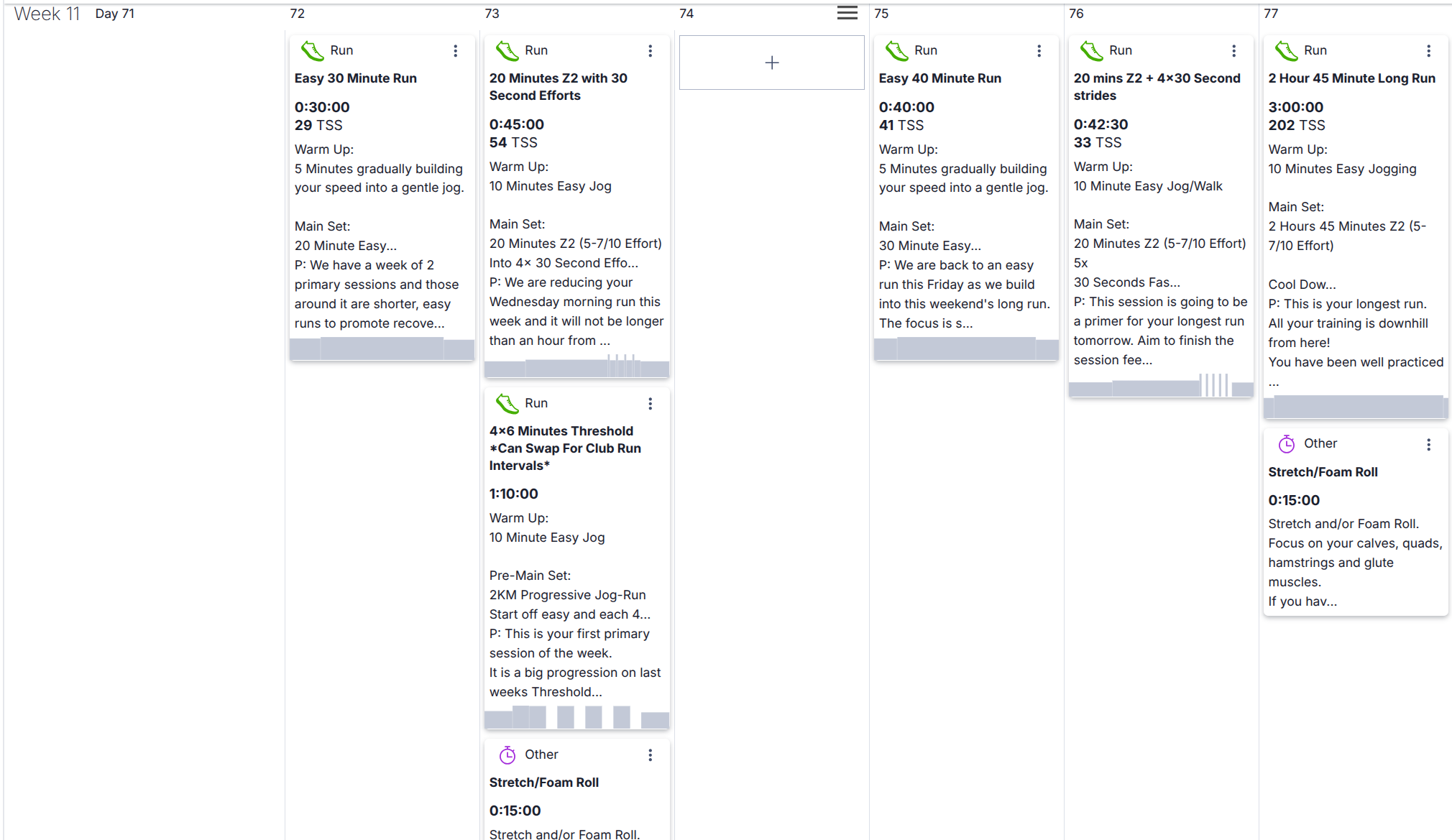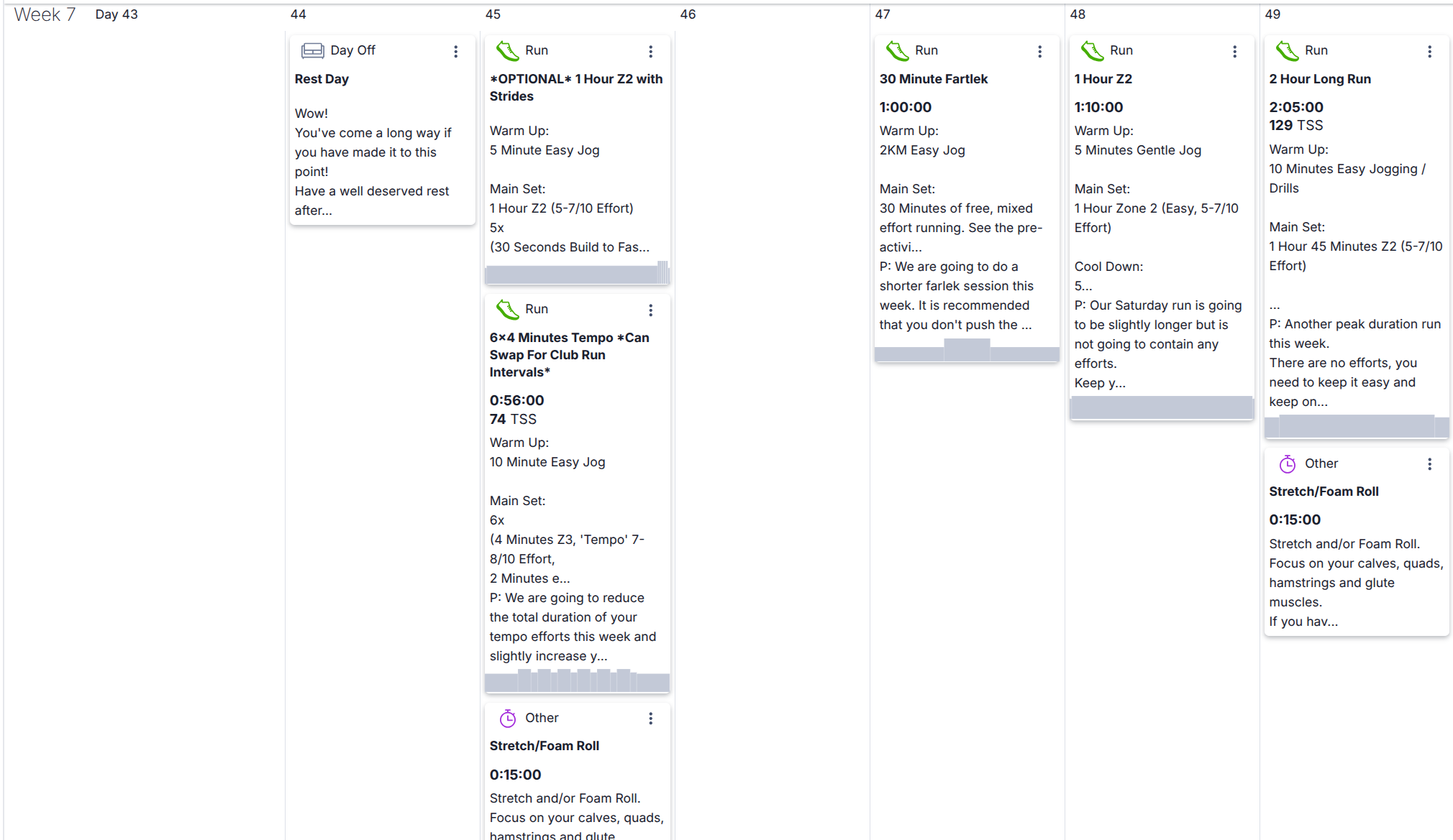 Training sessions are written in an optimal order for improvement, progression and recovery, but plans change and when they do you can move sessions across days and weeks with a premium training peaks account.