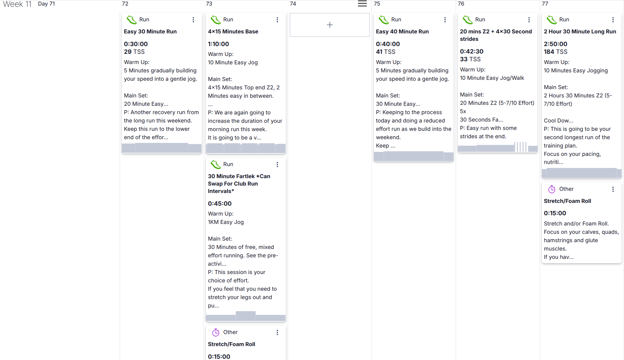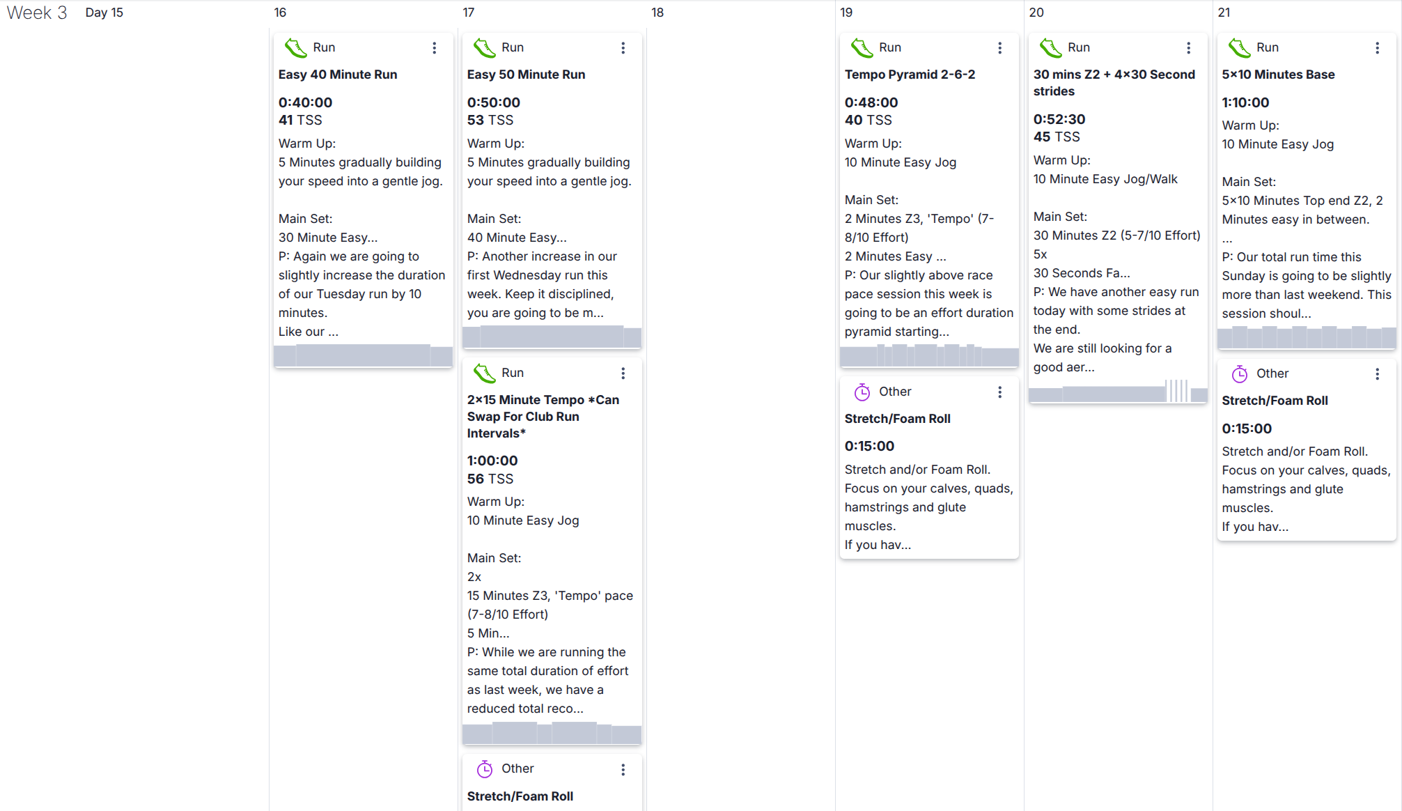 Training sessions are written in an optimal order for improvement, progression and recovery, but plans change and when they do you can move sessions across days and weeks with a premium training peaks account.