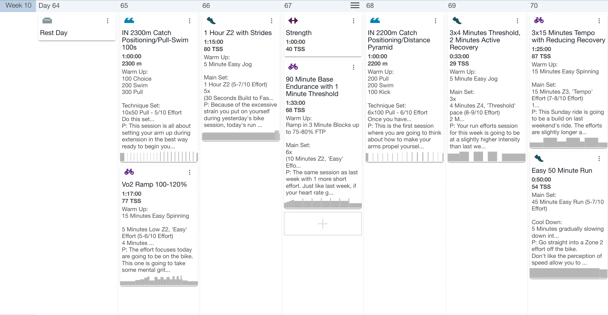 Training sessions are written in an optimal order for improvement, progression and recovery, but plans change and when they do you can move sessions across days and weeks with a premium training peaks account.